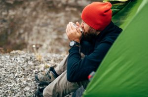 Side view image of young explorer man drinking hot beverage in mountains, sitting near to bonfire, relaxing after trekking. Traveler man in red hat holding a mug of tea after hiking. Travel, people
